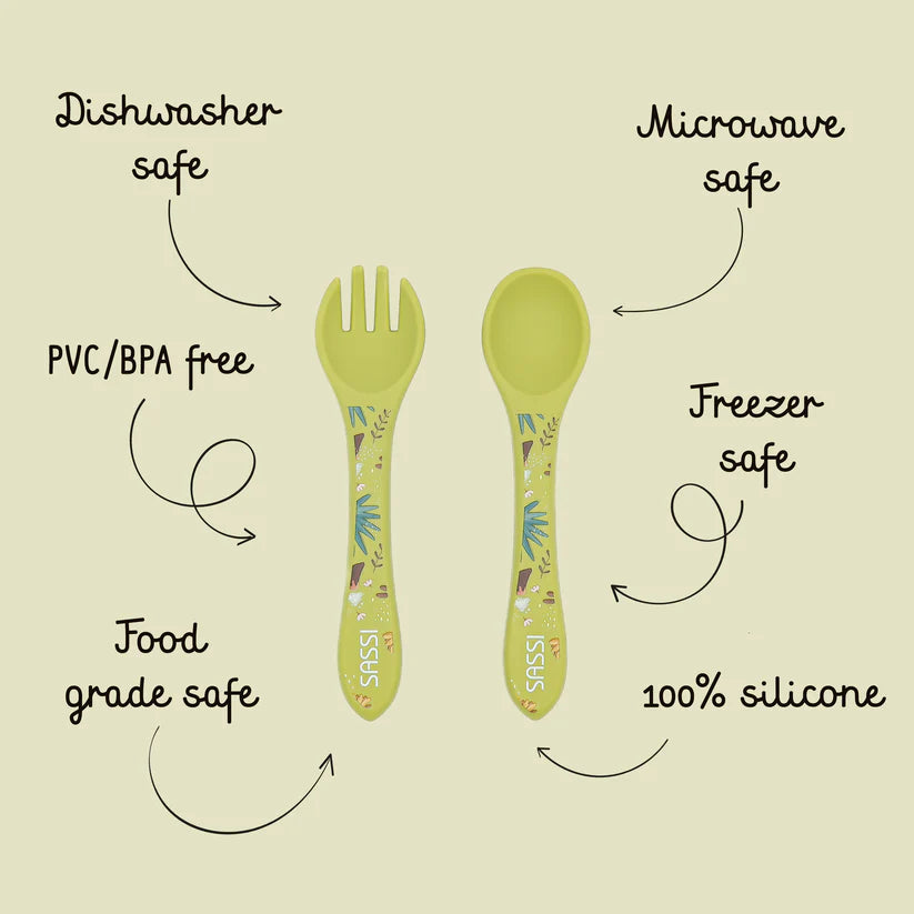 Haz del destete un momento seguro, divertido y lleno de ternura con el kit de tenedor y cuchara de silicona Cracky El Dinosaurio de SASSI 🦥✨. Diseñados especialmente para las manitos pequeñas, estos cubiertos acompañan a tu bebé en sus primeras comidas fomentando la autonomía y la confianza al comer.