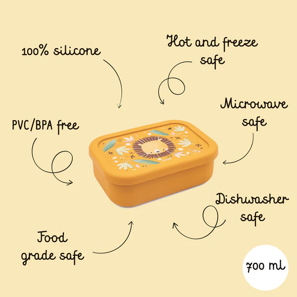 Fabricada en silicona de grado alimenticio, es segura, resistente y suave al tacto. Su diseño tipo bento permite organizar los alimentos fácilmente y cuenta con un sello hermético que ayuda a evitar derrames, manteniendo la mochila limpia y ordenada.