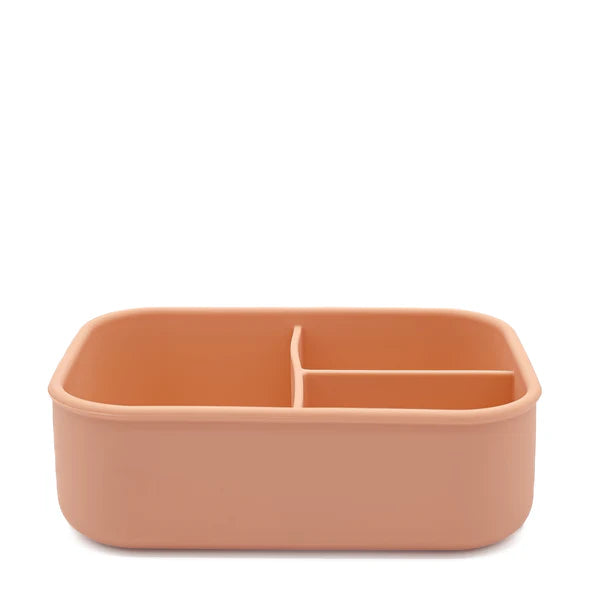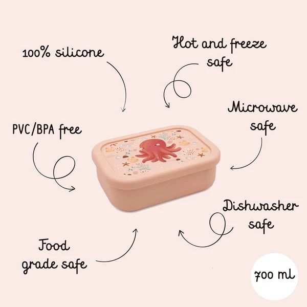Fabricada en silicona de grado alimenticio, es segura, resistente y suave al tacto. Su diseño tipo bento permite organizar los alimentos fácilmente y cuenta con un sello hermético que ayuda a evitar derrames, manteniendo la mochila limpia y ordenada.